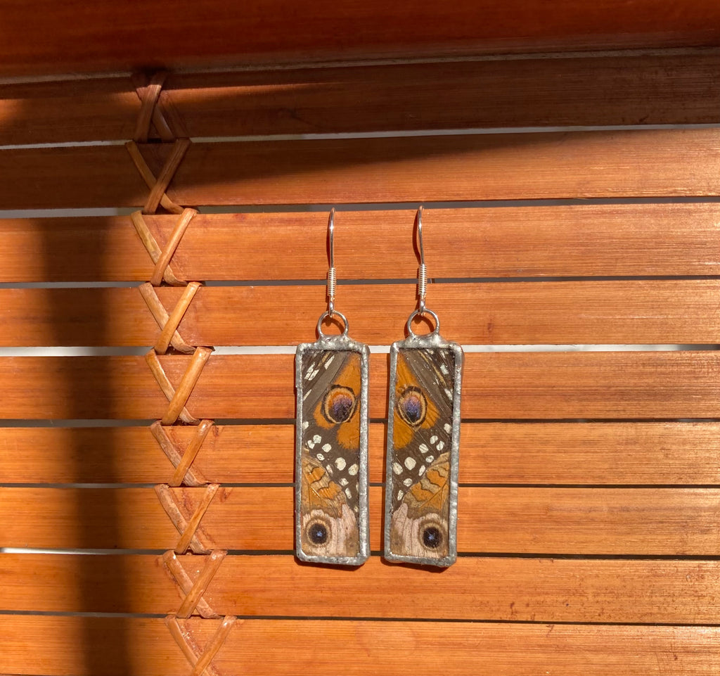 Buckeye and monarch butterfly wing collage earrings on sterling silver ear hooks.