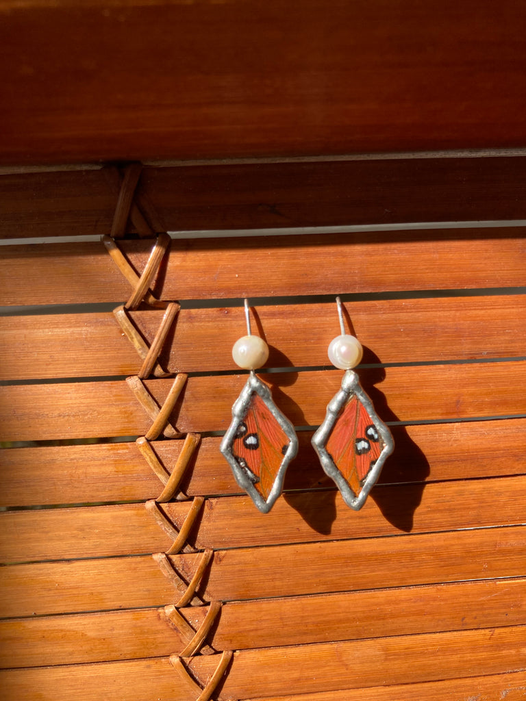 Gulf fritillary butterfly wings and cultured pearls on sterling silver ear hooks.