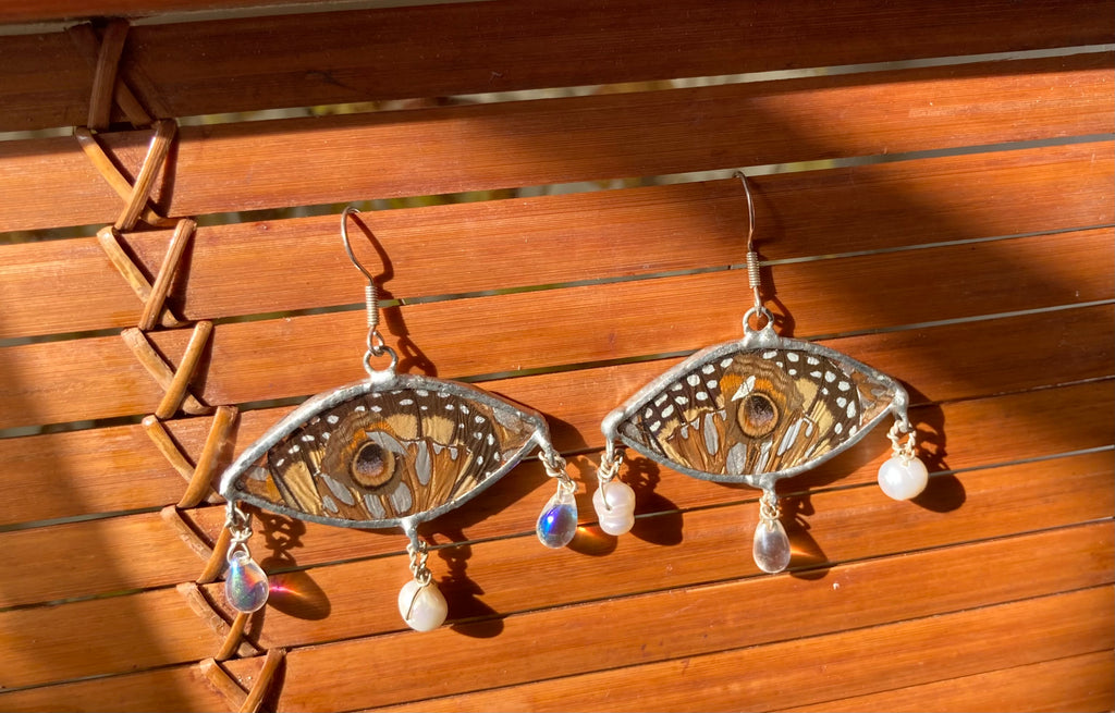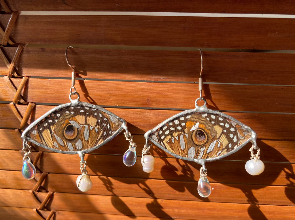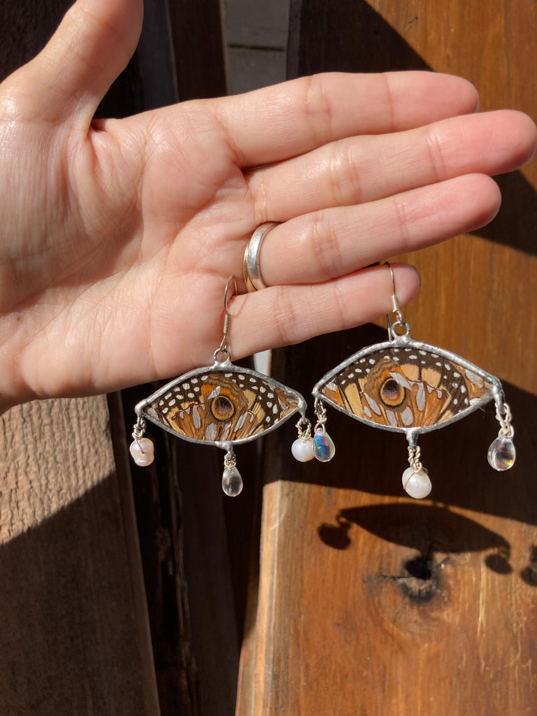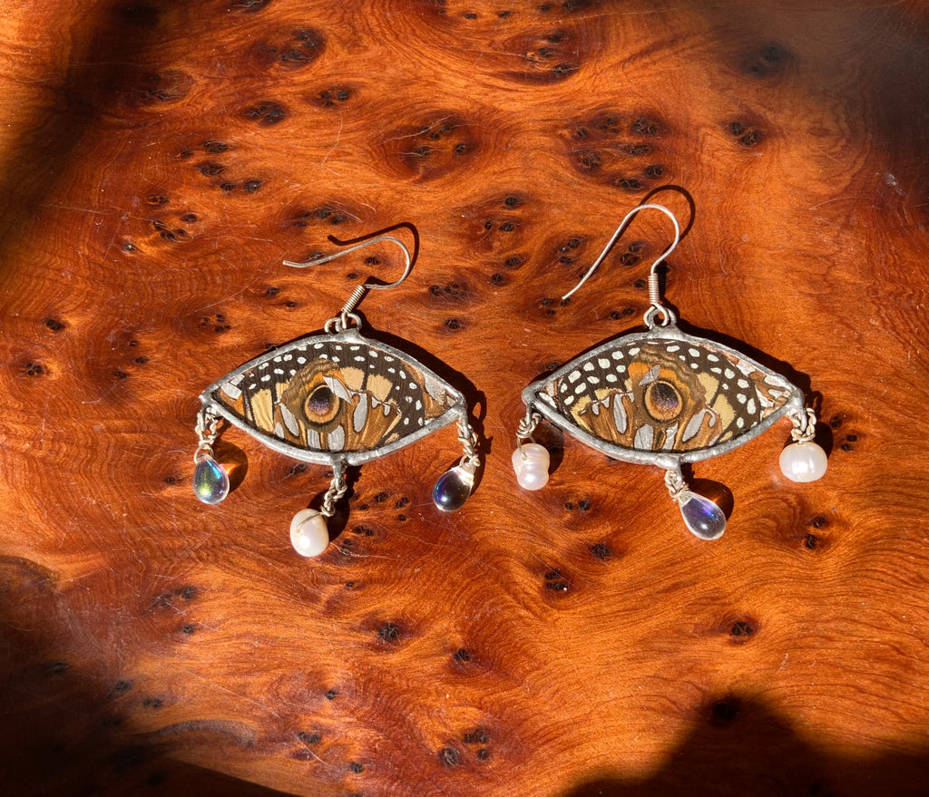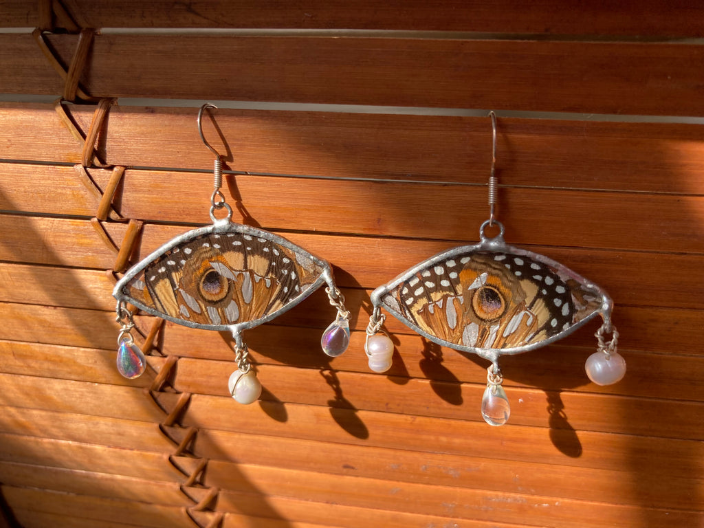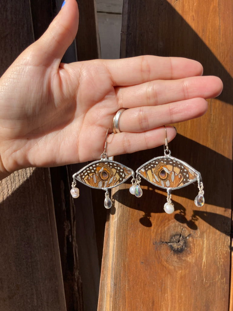 Monarch, buckeye, & gulf fritillary butterfly wing collage earrings with glass beads and cultured pearl beads on sterling silver ear hooks. These are on the larger side.