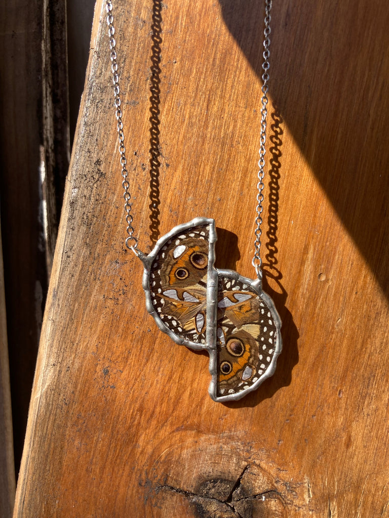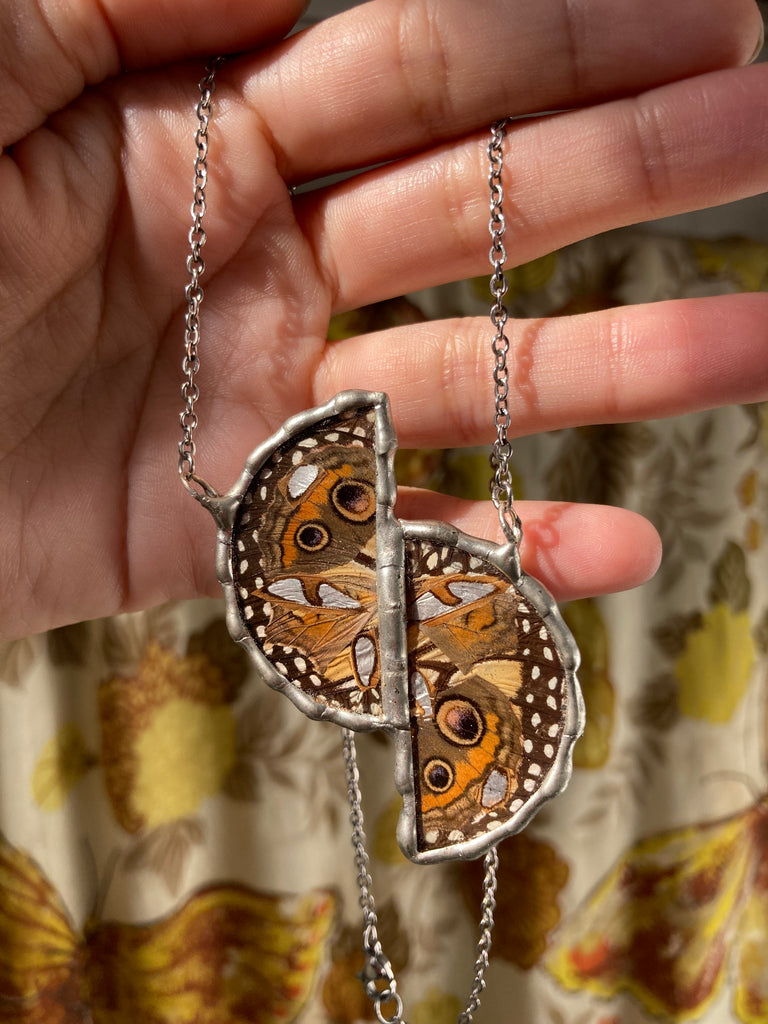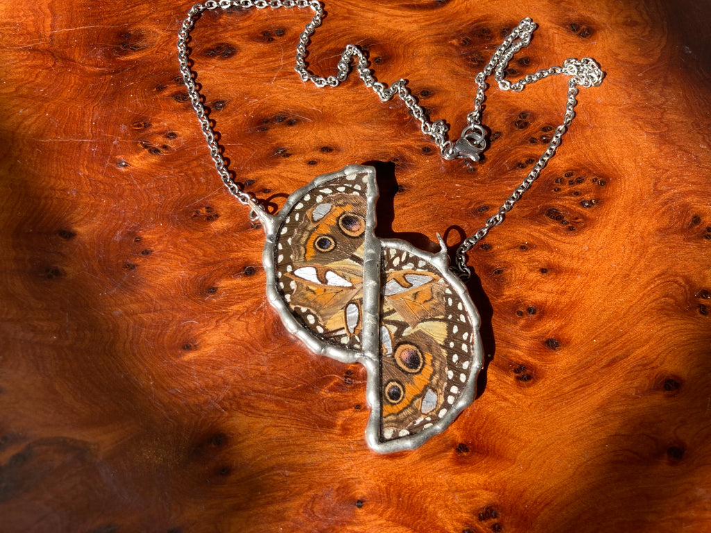 Buckeye, monarch, and gulf fritillary collage necklace on 16” stainless steel chain.