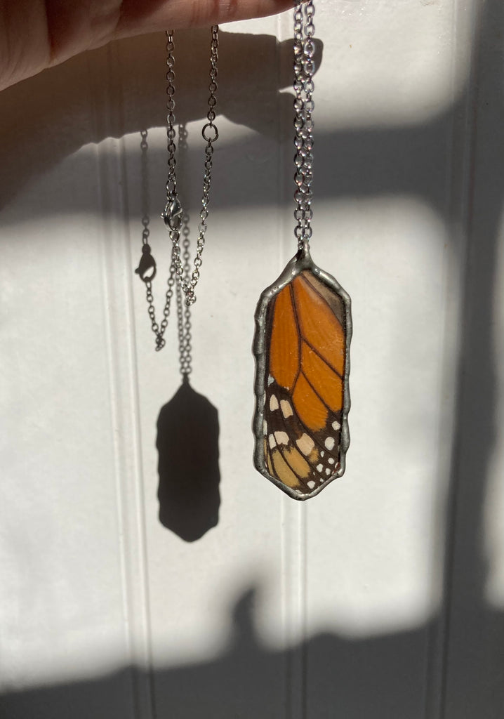 Monarch butterfly wing necklace on 16” stainless steel chain.
